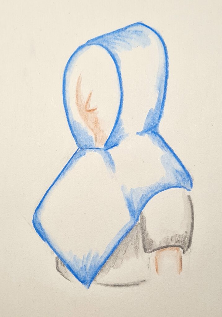 Eine Haube zum rein schlüpfen, die mit einem breiten Kragen versehen ist, der die Schultern bedeckt. Gefertigt wird sie aus mehreren viereckigen Stoffstücken