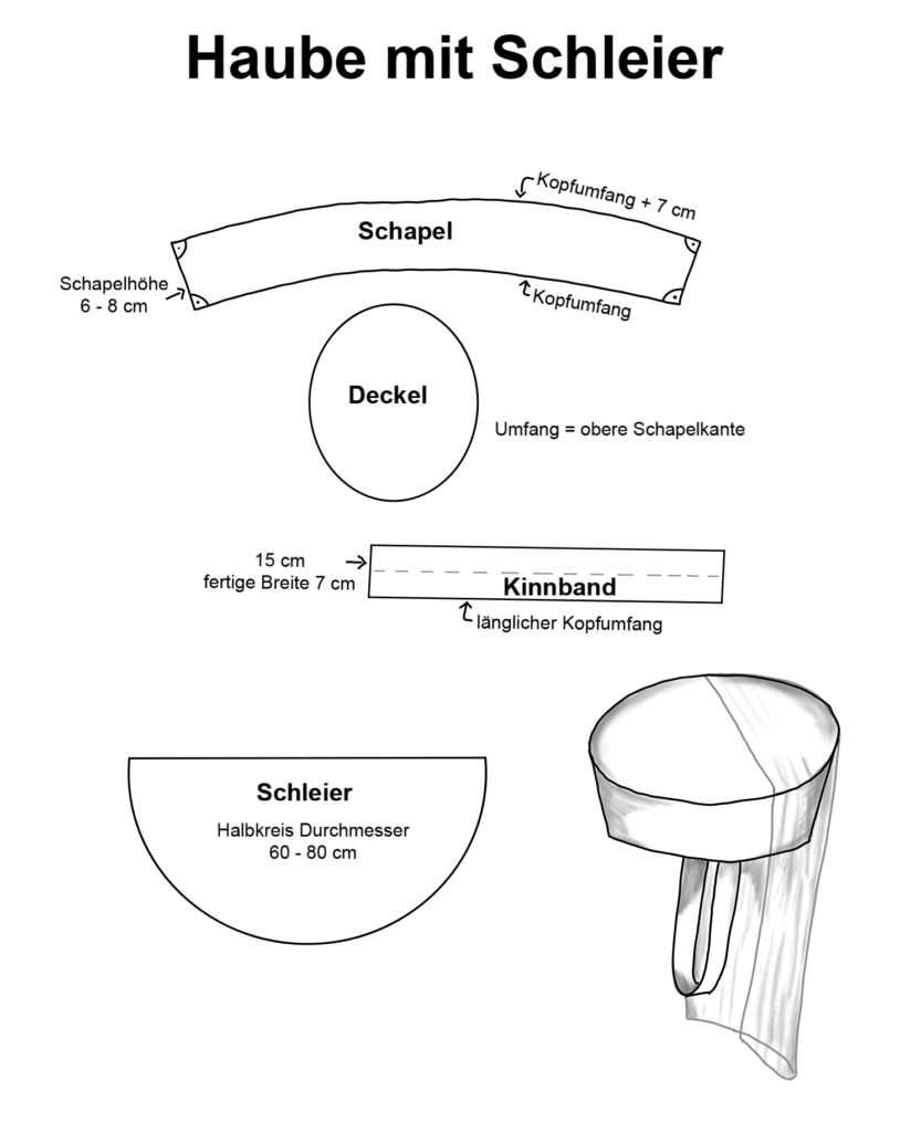 - Schritt: Zeichne dir alle Schnittteile auf und schneide sie zu. Nahtzugabe nicht vergessen. Schleier aus dem durchsichtigen Stoff, alles andere aus dem blickdichten.